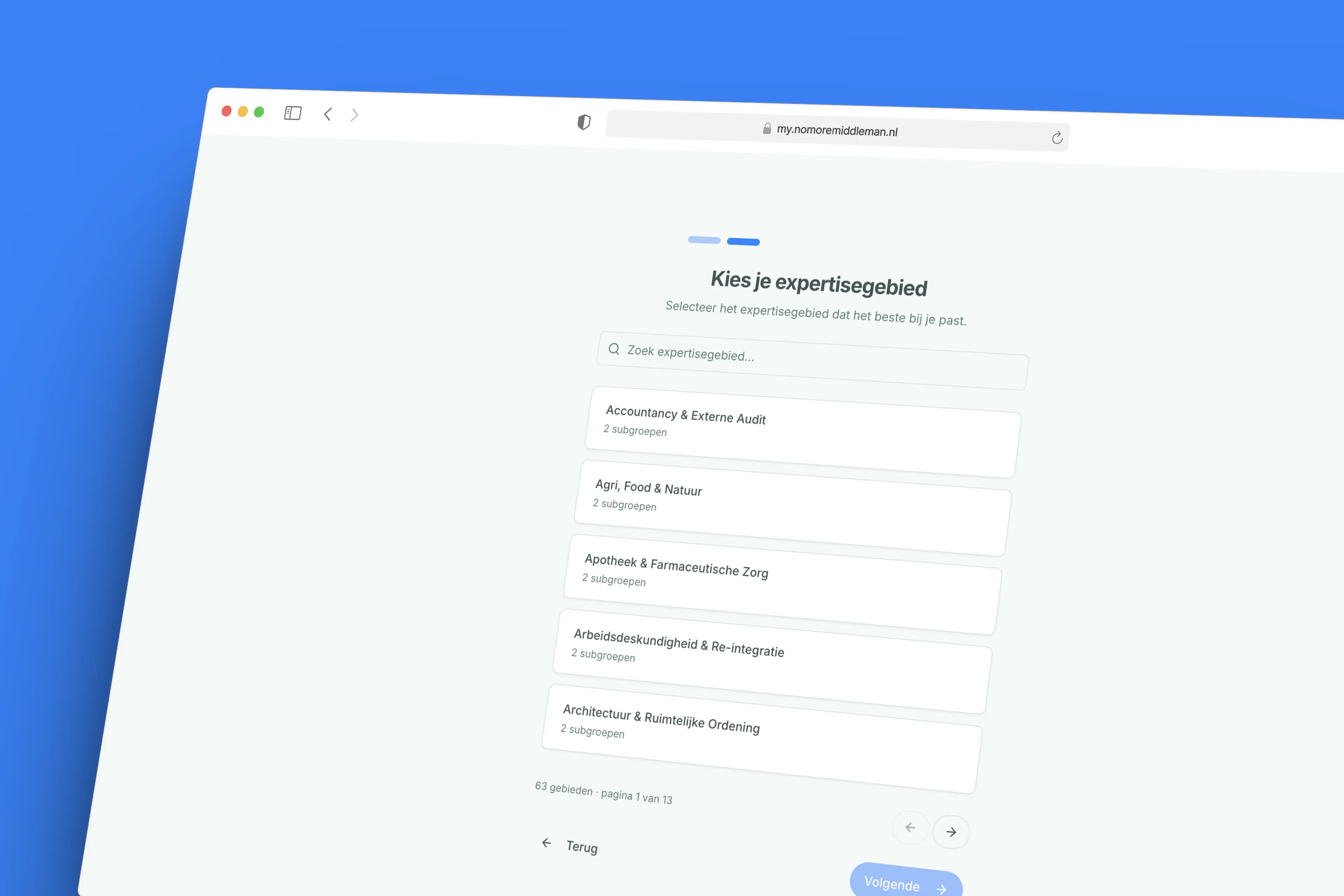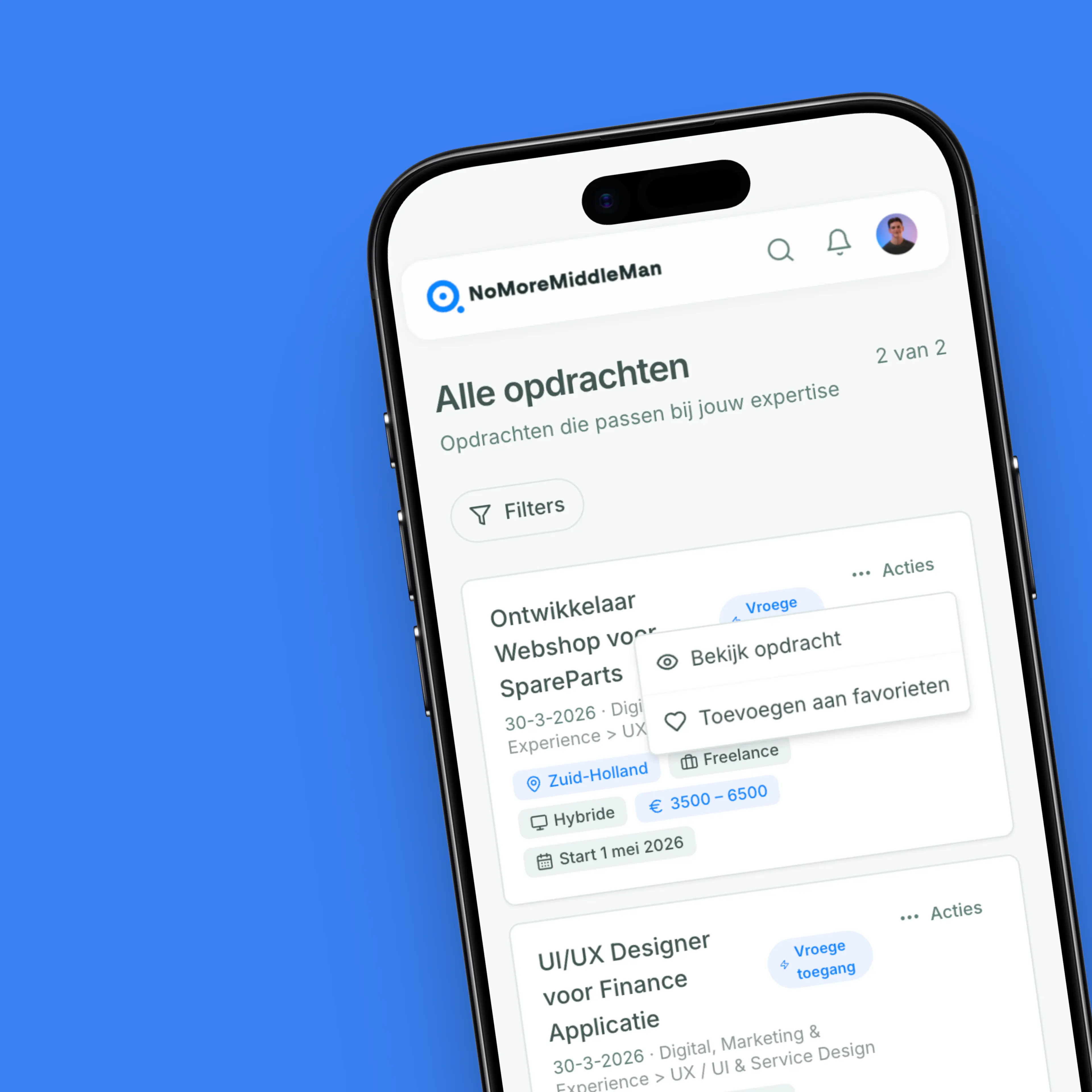 NoMoreMiddleMan is geen bemiddelaar. Wij verdienen niet aan jouw uren. Wij zijn een platform dat jou als ZZP'er direct in contact brengt met opdrachtgevers — de échte klant, niet een tussenpartij.
